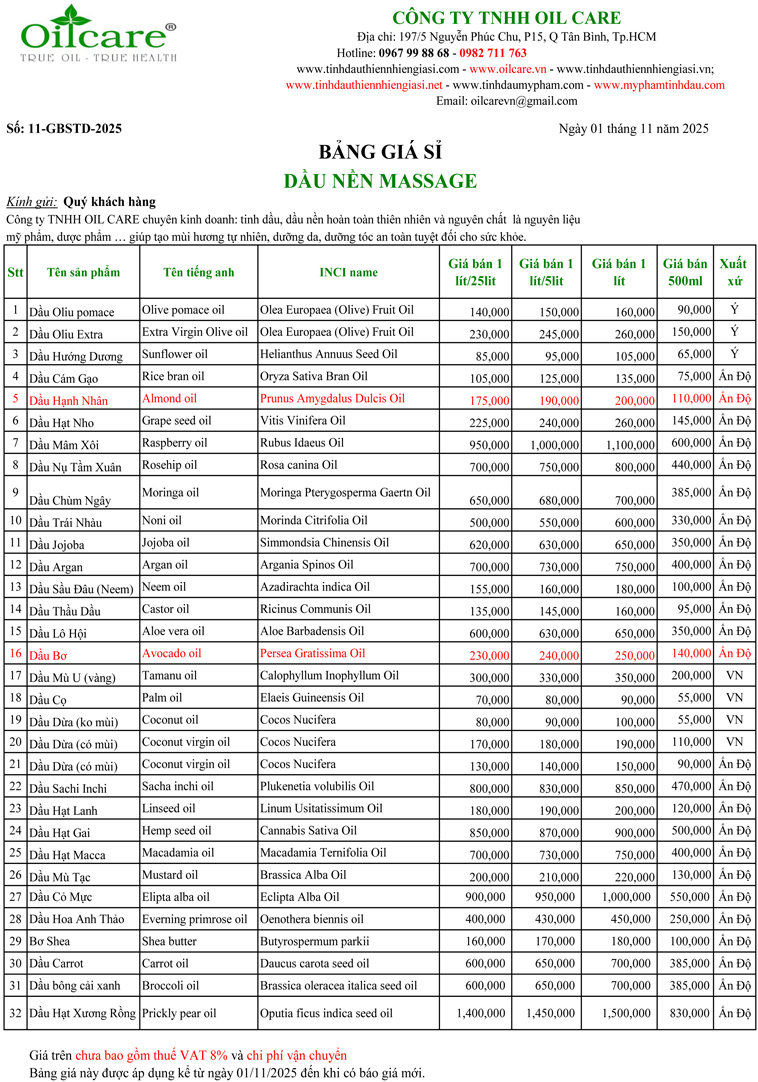 Hãy lick vào bảng giá sỉ  và dowload để xem giá bán sỉ tinh dầu oil care khi mua 25kg, 5 lít (kg), 1 lit và 500ml