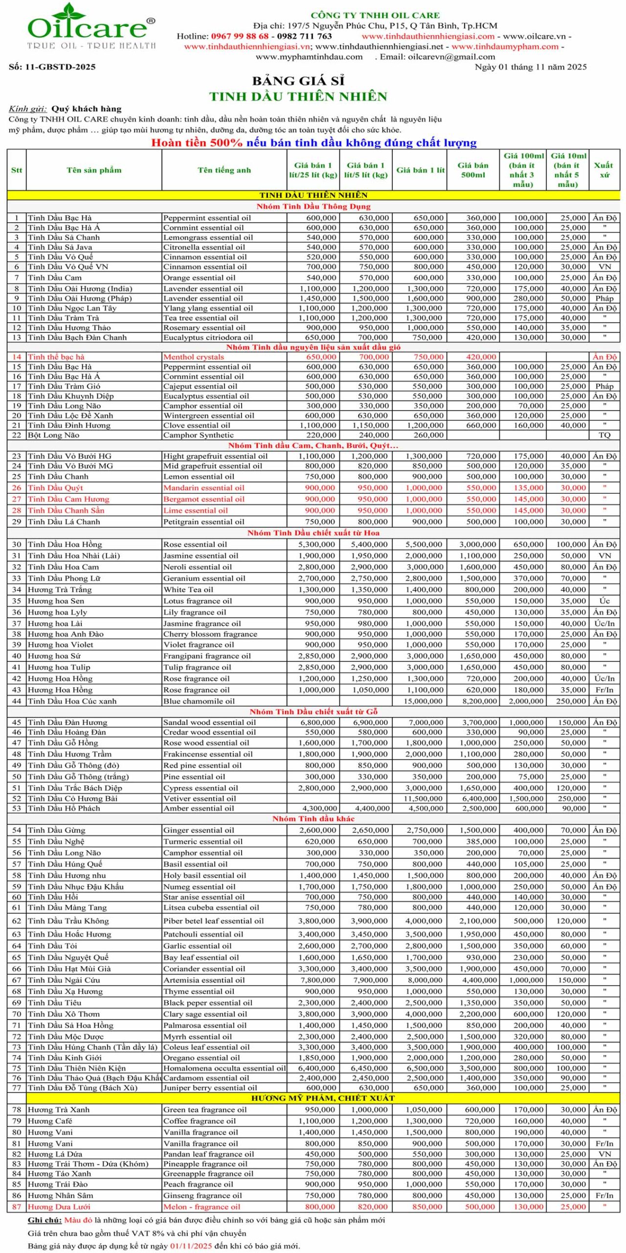 Mua lẻ theo ml liên hệ: 0941 438 492 (Ms Anh) – 0902 854 437 (Ms Thơm) – 0938 288 144 (Ms Trang)