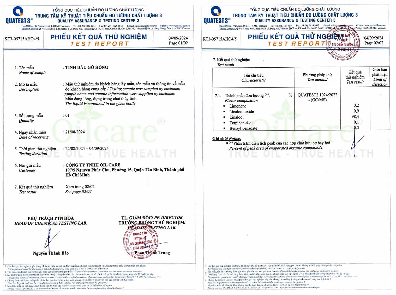 Công ty Oil Care cam kết chất lượng tinh dầu thông qua kiểm nghiệm tại Trung tâm Kỹ thuật Tiêu chuẩn Đo lường Chất lượng 3 (QUATEST 3). Dưới đây là bản kiểm nghiệm mới nhất dành cho sản phẩm tinh dầu gỗ hồng nguyên chất bán buôn:
