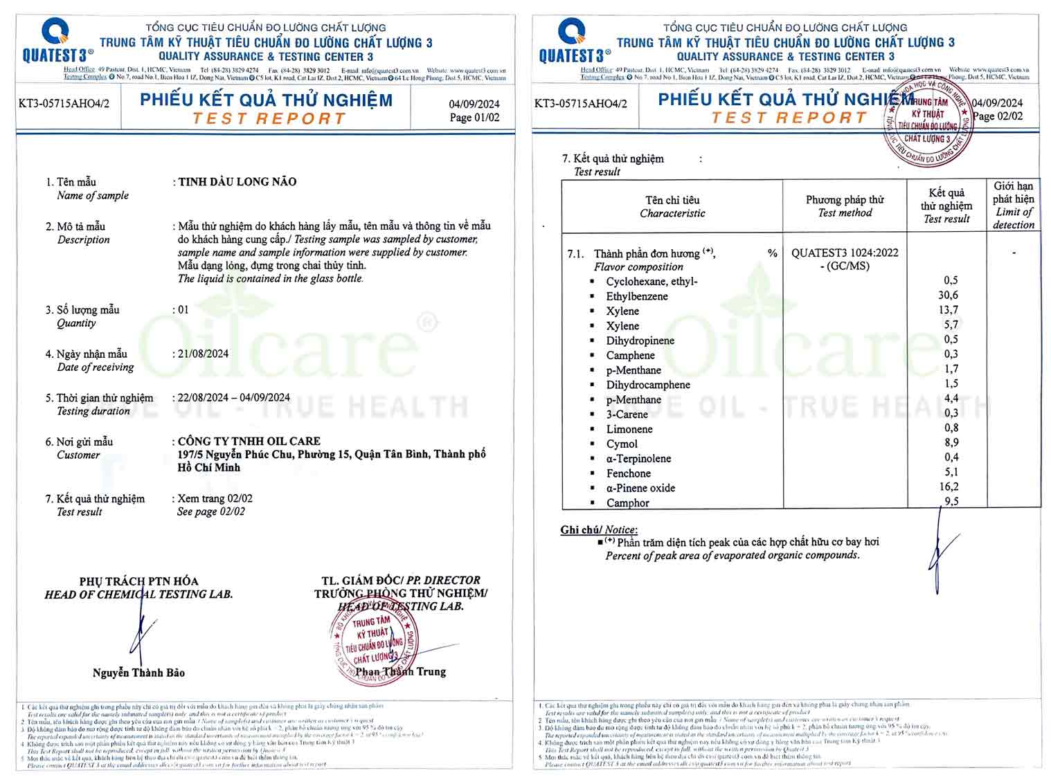 Công ty Oil Care cam kết chất lượng tinh dầu thông qua kiểm nghiệm tại Trung tâm Kỹ thuật Tiêu chuẩn Đo lường Chất lượng 3 (QUATEST 3). Dưới đây là bản kiểm nghiệm mới nhất dành cho sản phẩm tinh dầu long não nguyên chất bán buôn: