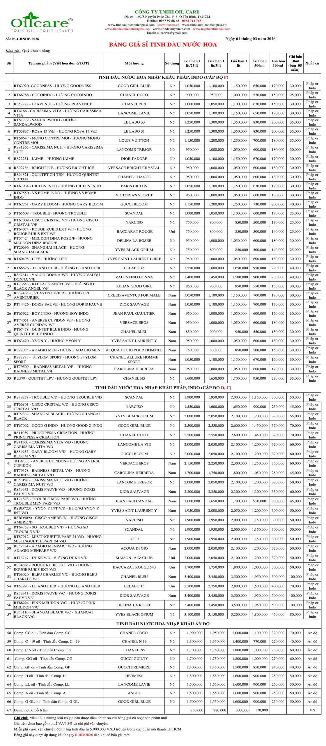 Xem giá bán sỉ lít kg buôn rẻ hơn 60 loại tinh dầu nước hoa tại đây